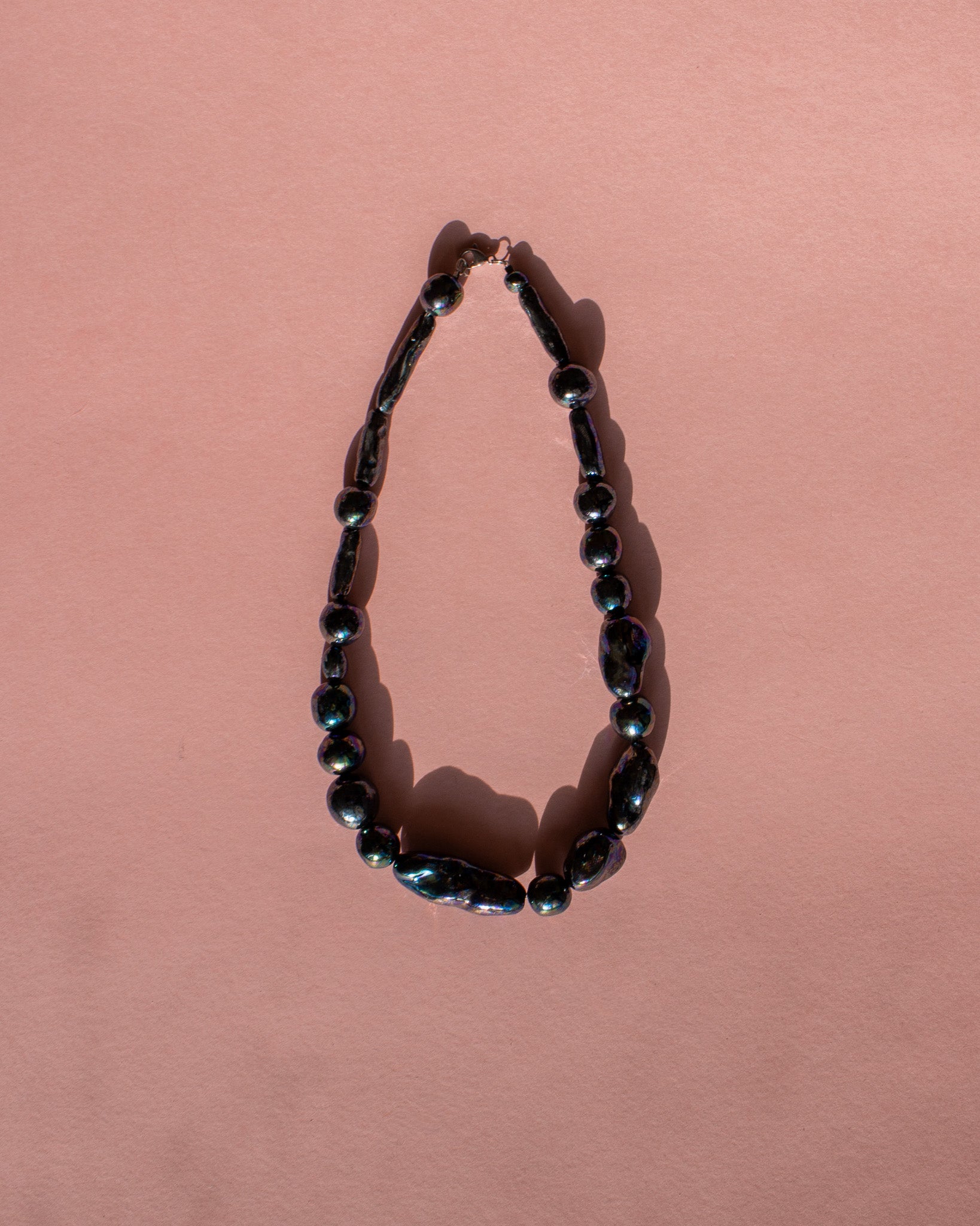 Each baroque pearl is hand-shaped from ceramic clay, covered with black glaze, and finished with a pearlescent lustre.